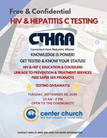 CTHRA presents HIV & Hepatitis C Testing on Tuesday, 9/30/2025 from 10:00am-2:00pm at Center Church, 60 Gold Street, Hartford, CT. 06103.